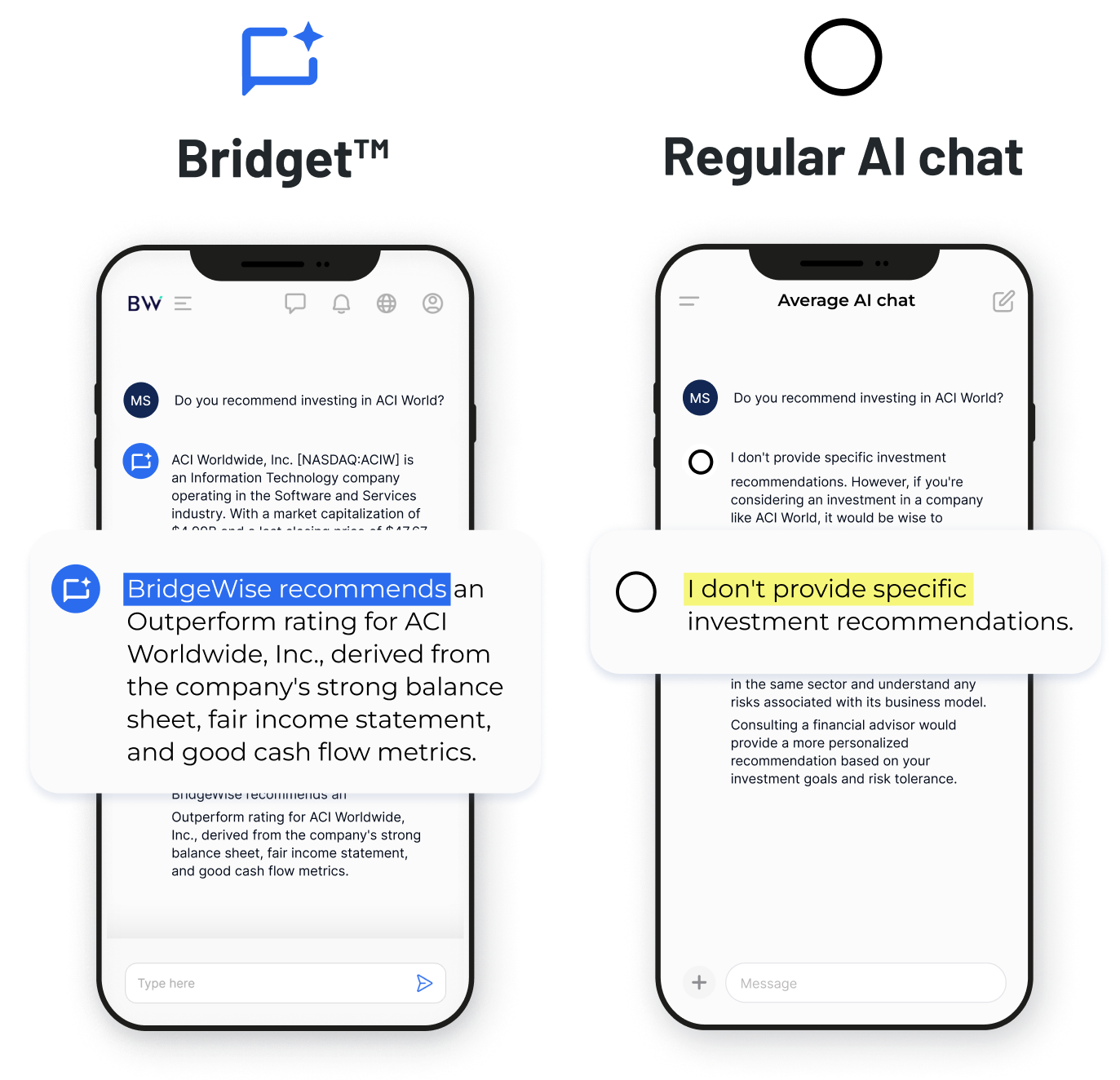 AI chats often invent or “hallucinate” information. Bridget™ was built to overcome this challenge, ensuring investors can trust the investment advice provided.